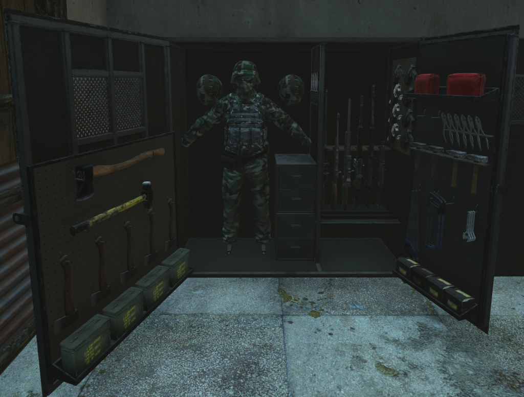 Perfect for storing tools, hammers, planks, and metal – neatly organized and easily accessible!Weapon Cabinet: